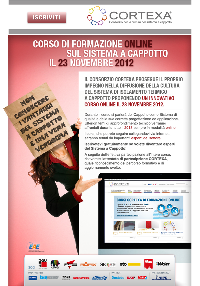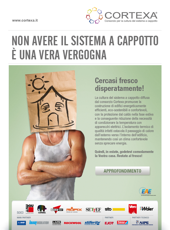 Le newsletter Cortexa 2012 riprendono il concept creativo “Vergogna”, oggetto della quarta compagna pubblicitaria Cortexa, utilizzata nel triennio 2011-2013. Questo concept è stato adattato per la promozione delle varie attività del Consorzio, come ad esempio i corsi di formazione online sul Sistema a Cappotto.